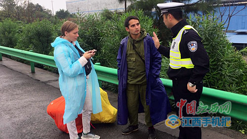 10月22日,江西高速交警直属四支队第一大队民警在沪昆高速公路新余段巡逻时,发现两名来自俄罗斯的驴友在高速公路上行走。在了解情况后,民警经过4个多小时的努力,在樟树服务区终于帮他们搭上了前往目的地南昌的便车。